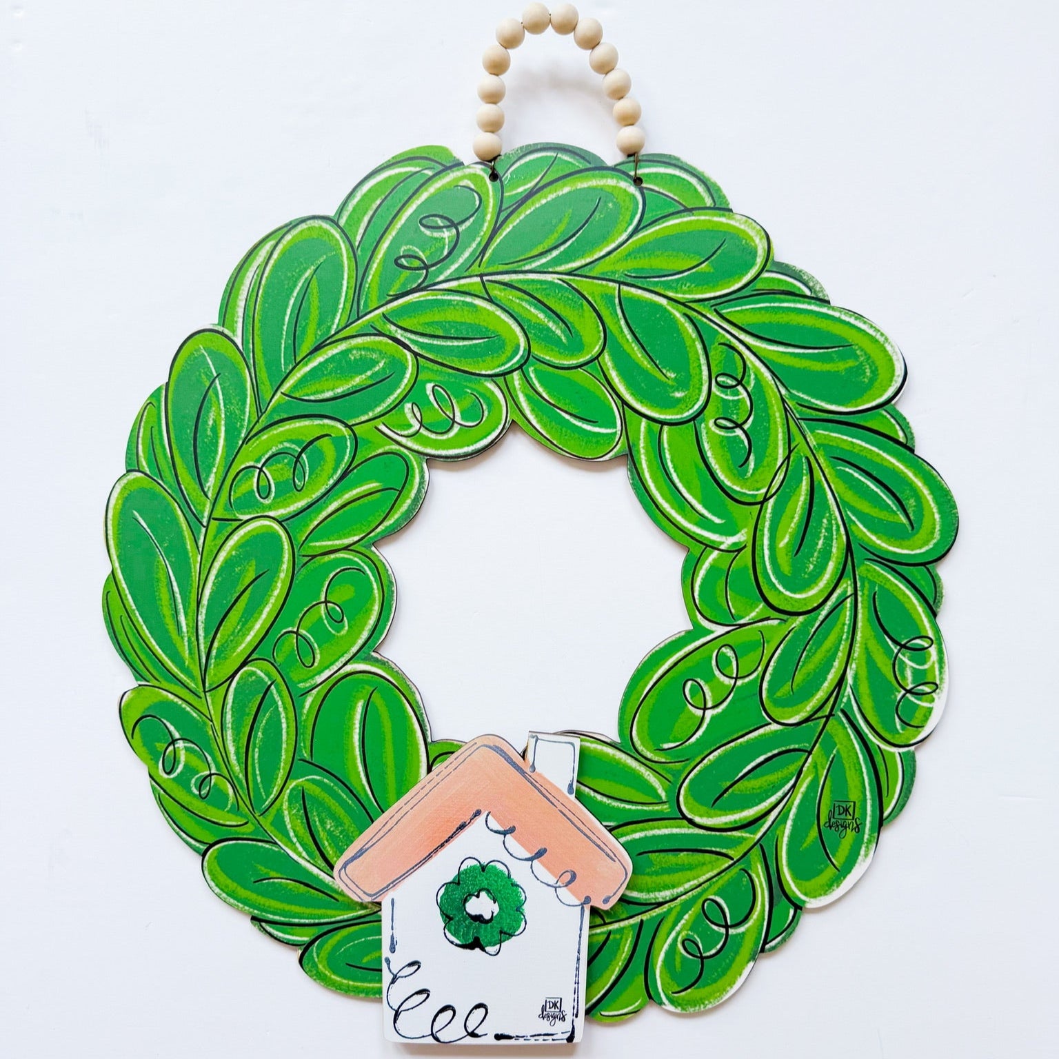 The Wreath Door Hanger is a UV Printed Door hanger measuring 23" long that is perfect for indoor or outdoor use. All original designs are printed on a moisture resistant high quality 1/4" board and sealed for additional protection with 2 coats of a gloss finish. DK hangers come with a fully wired beaded handle.
