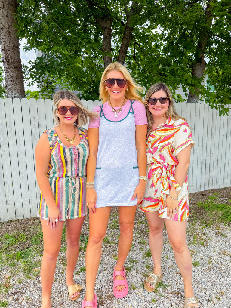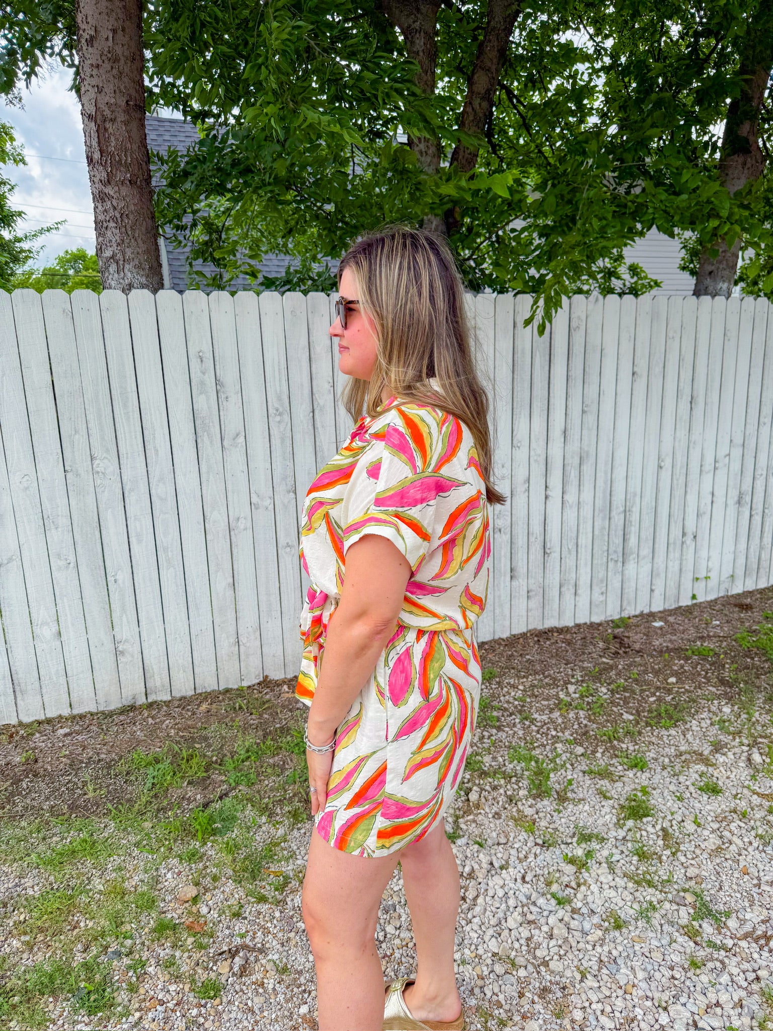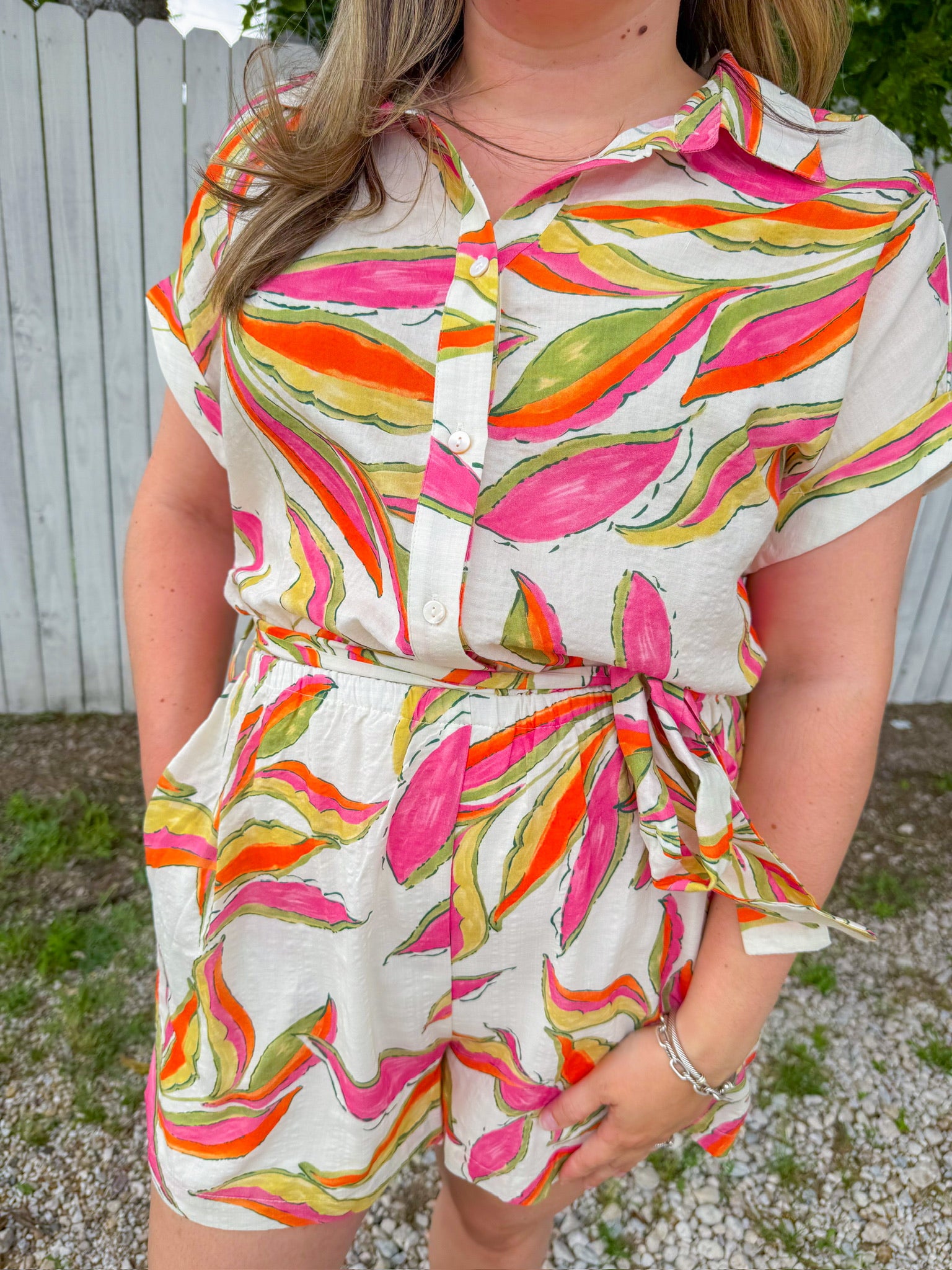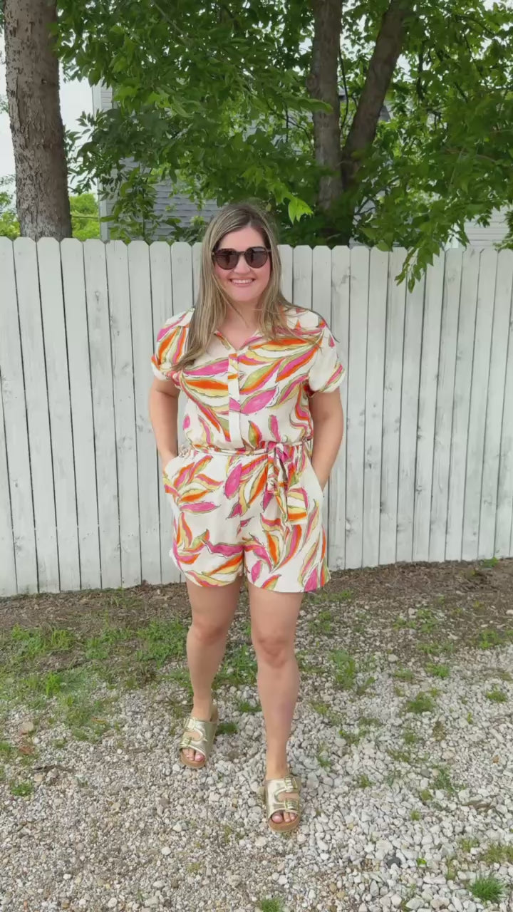 This romper is giving tropical vacation vibes in the best way with its playful pink-and-orange leaf print and breezy fabric. The button-up front and cinched waist keep it flattering and easy, whether you’re hitting the beach boardwalk or grabbing brunch in the sun
